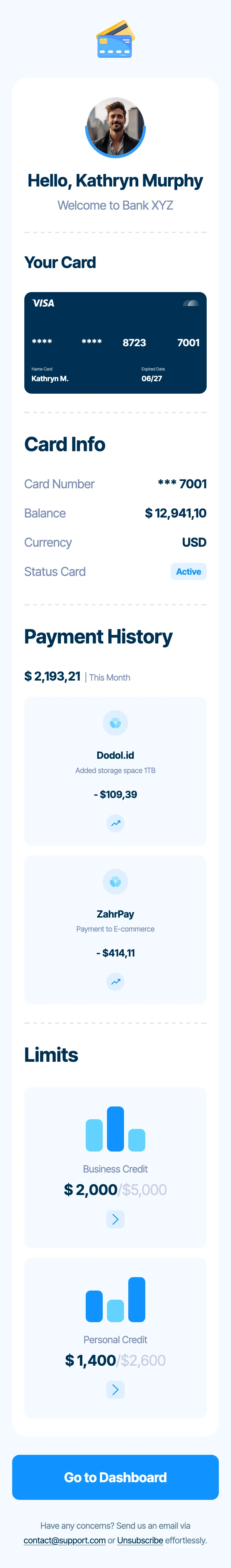 Banking emails need to look trustworthy, be easy to scan, and present sensitive information clearly. This banking email template achieves all three with a structured card-based layout that organizes data into digestible sections. Customers can quickly check their card details, review recent payments, and monitor their credit limits without feeling overwhelmed. A professional, well-organized banking email reduces support inquiries and gives your customers confidence that their financial information is handled with care.