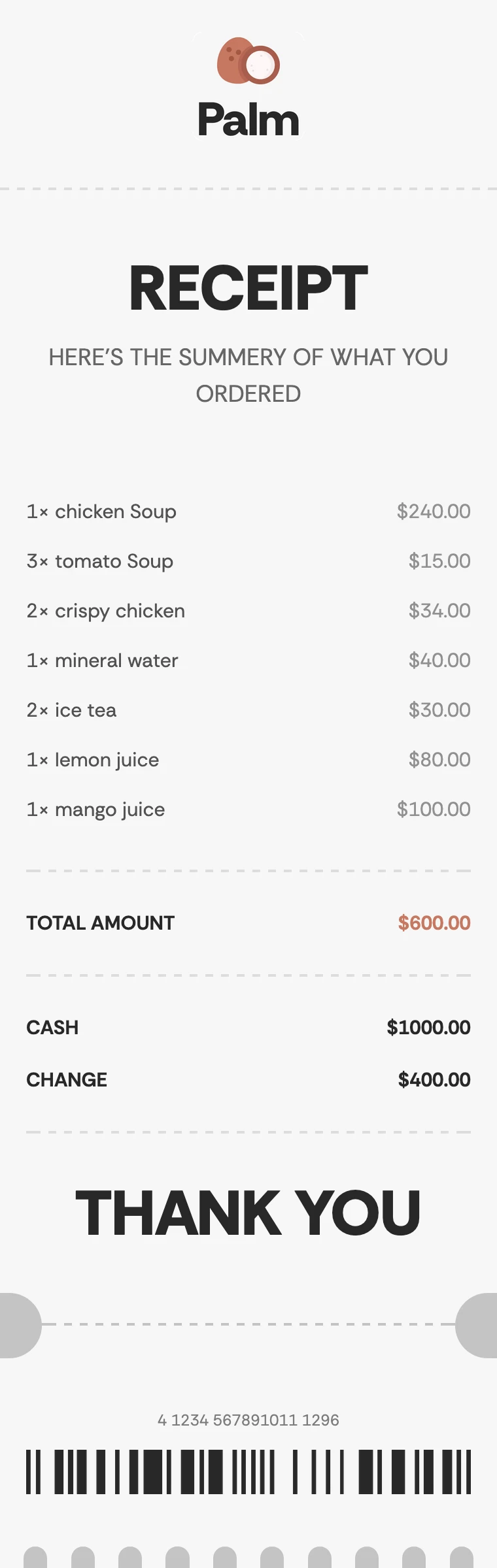 The design focuses on clarity. It includes a branded receipt header, a full summary of ordered items, a highlighted total amount section, and a payment summary that shows both cash and change. The thank you section at the bottom gives the message a friendly finish, while the barcode area helps the receipt feel more complete and familiar.