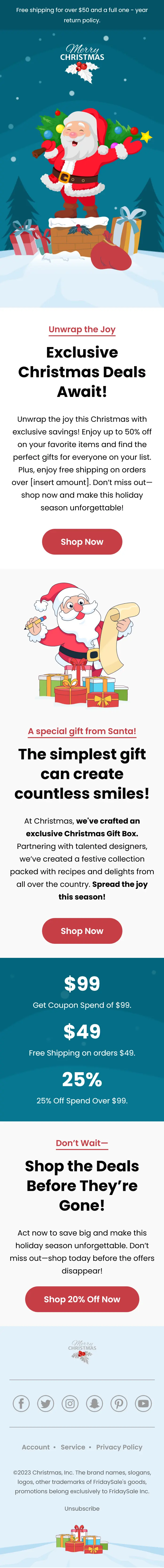 The email closes with a final reminder encouraging readers to shop before the holiday deals disappear. The footer includes brand information, social media icons, account and service links, and an unsubscribe option for compliance.