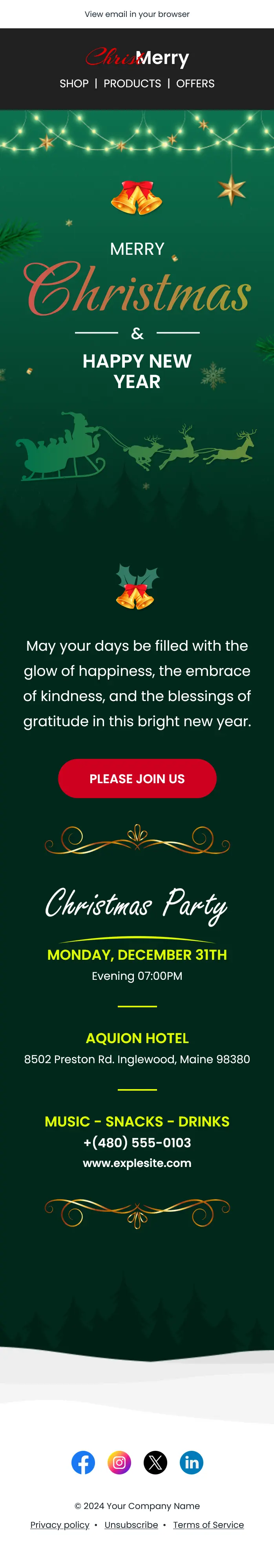 The central section of the email presents the main event invitation. A visual banner introduces a Christmas party, followed by detailed information about the event. The template clearly displays the event date, time, and location, including the venue name and address. Additional information such as music, snacks, and drinks is included to create excitement and encourage participation. Contact information and a website link allow guests to learn more about the event or confirm their attendance.