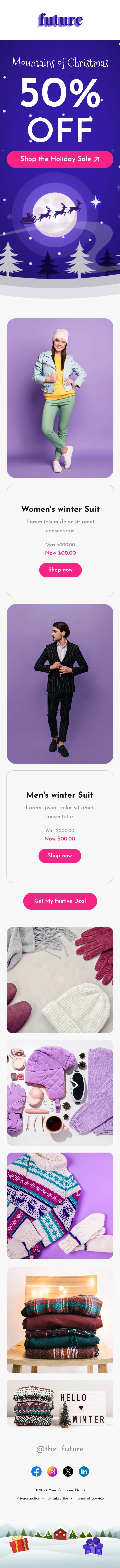 The layout of this account activation email template begins with a bold holiday themed banner that introduces the “Mountains of Christmas” sale. The headline clearly highlights a fifty percent discount, immediately capturing attention and encouraging users to explore the holiday promotion. A strong call to action invites readers to shop the holiday sale.