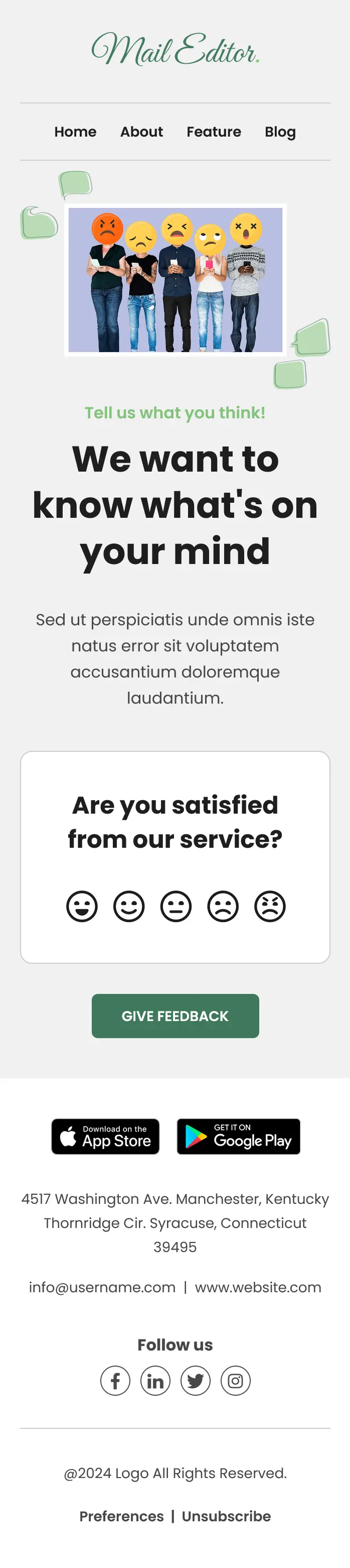 Below the banner, a simple question asks whether the user is satisfied with the service. Supporting visuals help make the email more engaging while keeping the focus on the feedback request. A clear Give Feedback call to action button allows users to quickly submit their opinion or access a feedback form.