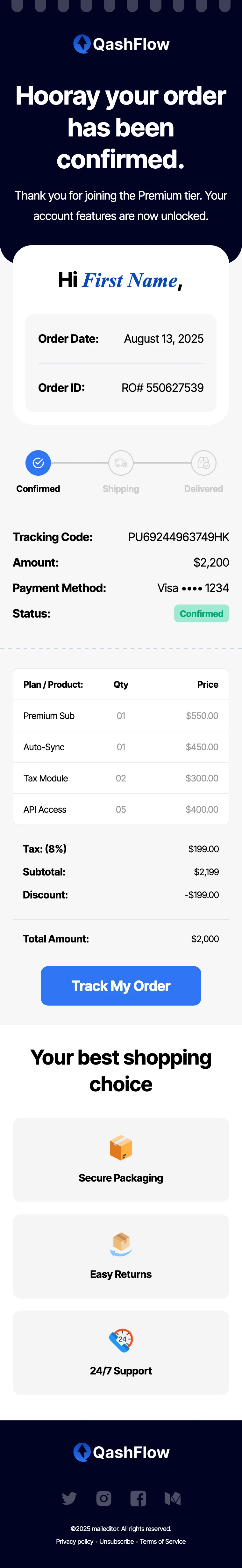 Perfect for ecommerce stores, SaaS subscriptions, premium plans, digital products, and online services. Whether confirming a physical shipment or a feature unlock, this template keeps customers informed and confident.
