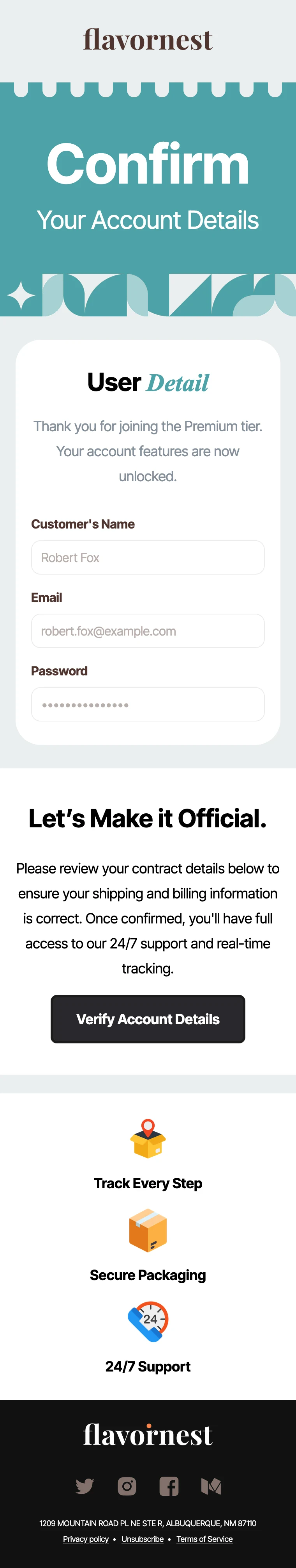 This confirmation email template opens with a bold, eye-catching header section featuring your brand name and a "Confirm Your Account Details" headline over a colorful, patterned background. Below it, a clean user details card displays the customer's name, email, and password in a structured format, along with a thank-you message for joining. The next section prompts the user to review their contract, shipping, and billing information with a prominent "Verify Account Details" CTA button. At the bottom, three feature icons highlight key selling points like order tracking, secure packaging, and 24/7 support to reinforce value right at the confirmation stage. The footer includes social media links, company address, and legal links.
