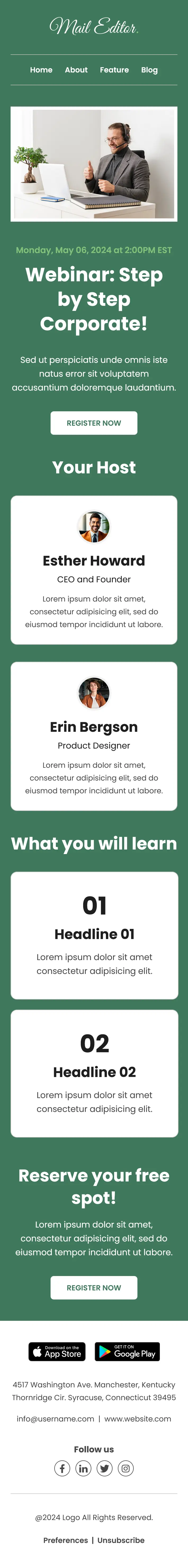 The template is mobile friendly, fully customizable in MailEditor, and exportable as clean HTML for seamless integration with your email marketing platform.