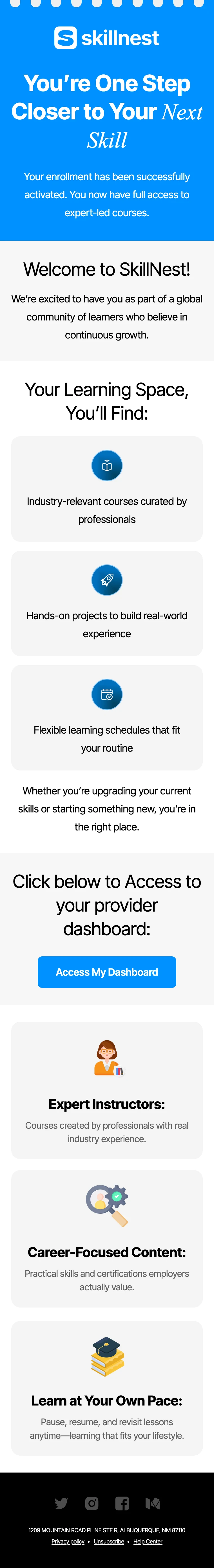 This course enrollment email template opens with a bright, attention-grabbing header featuring your brand name and a headline celebrating the learner's enrollment. A short confirmation message lets the user know their access is active. The welcome section introduces your platform and community with a warm, encouraging tone. Below that, a "Your Learning Space" block lists key platform features like industry-relevant courses, hands-on projects, and flexible scheduling using clean icon-based cards. A dashboard access section with a bold "Access My Dashboard" CTA button makes it easy for learners to jump right in. At the bottom, feature highlight cards showcase your platform's strengths like expert instructors, career-focused content, and self-paced learning. The footer includes social media links, company address, and legal links.