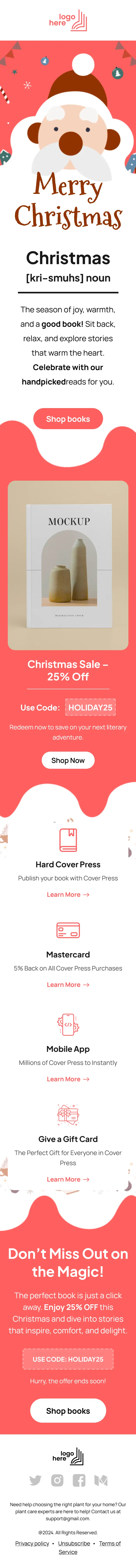 The layout of this festive-christmas-reading-newsletter-template begins with a festive header featuring a “Merry Christmas” greeting and a creative definition of Christmas as a season of joy, warmth, and reading. This introduction sets a calm and emotional tone, encouraging readers to unwind and enjoy stories that inspire. A Shop Books call to action follows, guiding users toward curated collections.