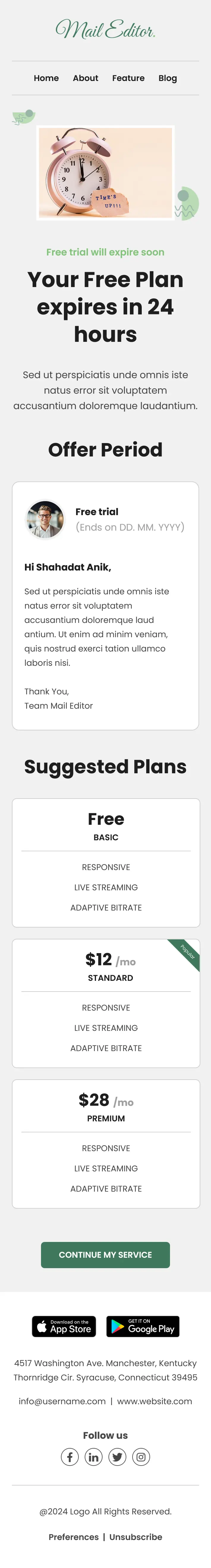 The layout of this free-trial-expiry-email-template begins with a branded header that includes navigation links such as Home, About, Feature, and Blog. A strong visual banner highlights the urgency with a message that the free plan will expire in 24 hours. This immediately captures attention and encourages users to act quickly.