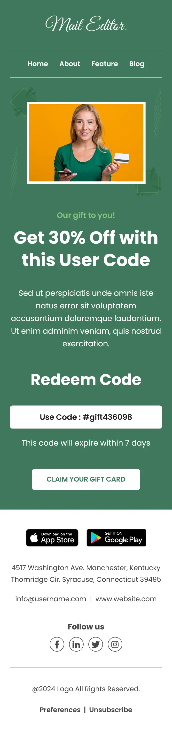 The layout of this gift-card-discount-email-template begins with a branded header that includes the company logo and navigation links such as Home, About, Feature, and Blog. A bold hero section introduces the main offer with the message “Our gift to you,” followed by a clear statement of the discount. The email highlights a 30% off offer using a unique user code, making the promotion feel personalized and exclusive.