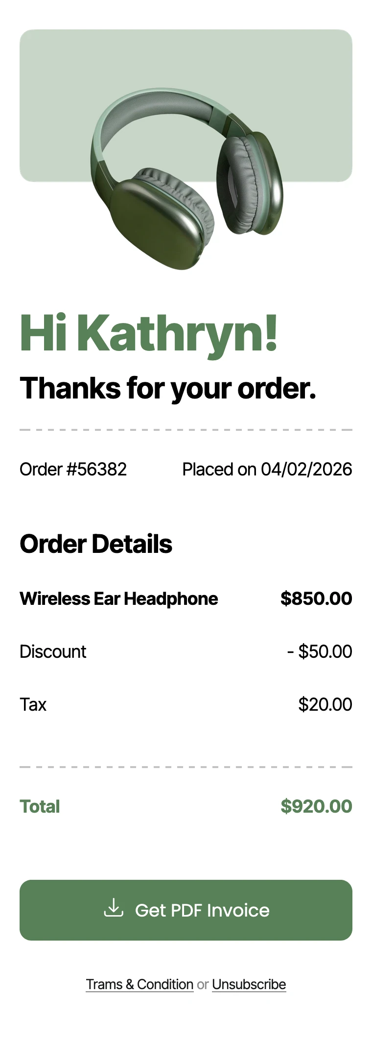 The design combines a product-focused presentation with a straightforward invoice summary. It opens with a friendly thank you message, followed by the order number and date, which gives the recipient immediate context. Below that, the order details section clearly lists the product, discount, tax, and final total, helping the customer review the purchase at a glance.