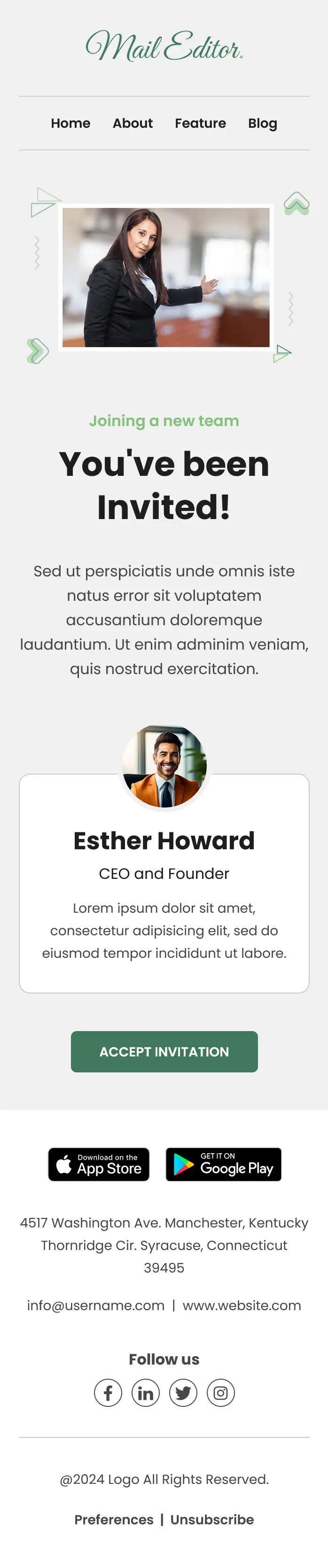 The body section provides a short explanation about the invitation and what the user can expect after joining. A dedicated profile section highlights the inviter, such as a CEO or team leader, including their name, role, and a brief description. This adds a personal touch and builds trust by showing who is behind the invitation.