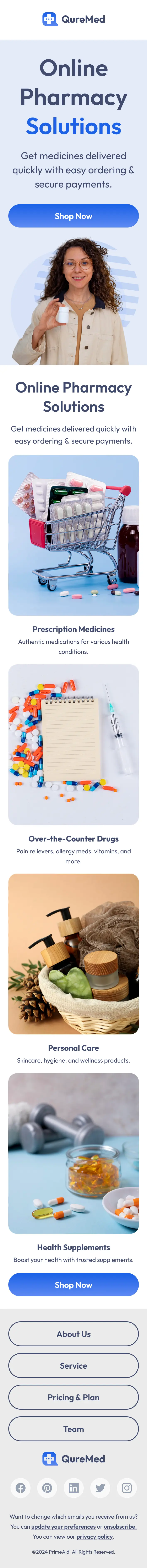 An online-pharmacy-newsletter-template is designed to promote healthcare products, simplify medicine access, and build trust with customers. This template is ideal for online pharmacies and healthcare platforms that want to highlight product categories, emphasize convenience, and encourage users to order essential items quickly and securely.