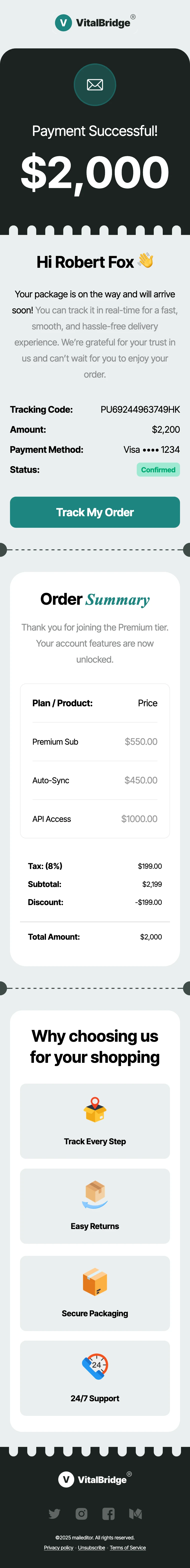 This payment successful email template combines transaction confirmation with real time order tracking, giving customers everything they need in one clear message.
