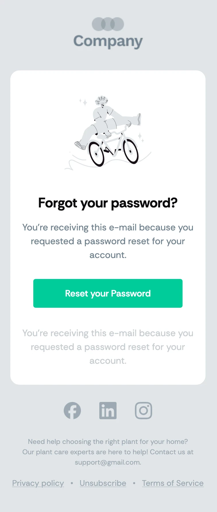 The layout is clean and easy to scan. It includes a clear heading, a short explanation of why the email was sent, and a prominent call to action button that directs the user to reset their password. This helps reduce confusion and makes the recovery process feel more trustworthy. The template also includes support information in the footer, giving users another way to get help if they did not request the reset or run into issues.
