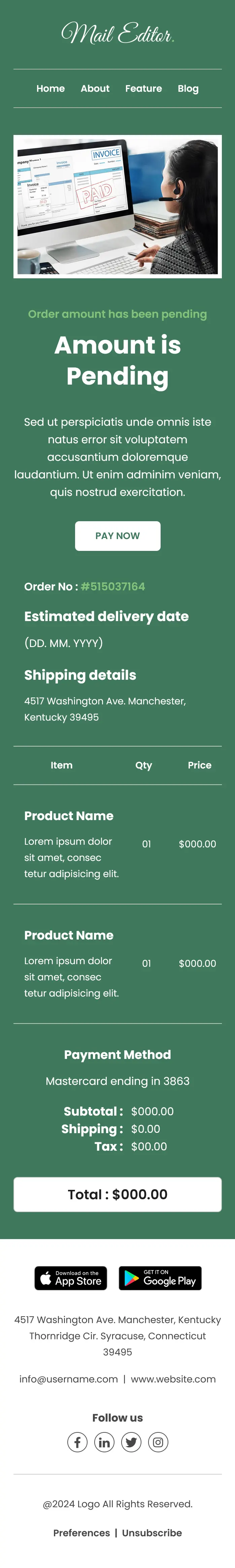 The layout of this pending-order-email-template begins with a branded header and navigation links such as Home, About, Feature, and Blog. A bold headline highlights that the order amount is pending, immediately informing the recipient about the status. Supporting text reassures the customer while prompting them to take action.