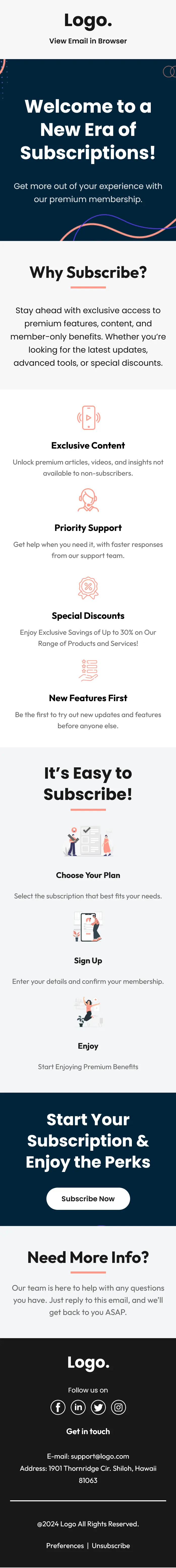 This premium-subscription-newsletter-template works well for SaaS platforms, content platforms, and membership based services that want to convert free users into premium subscribers. It allows businesses to showcase benefits in a structured way while guiding users through the subscription process with clear steps and calls to action.