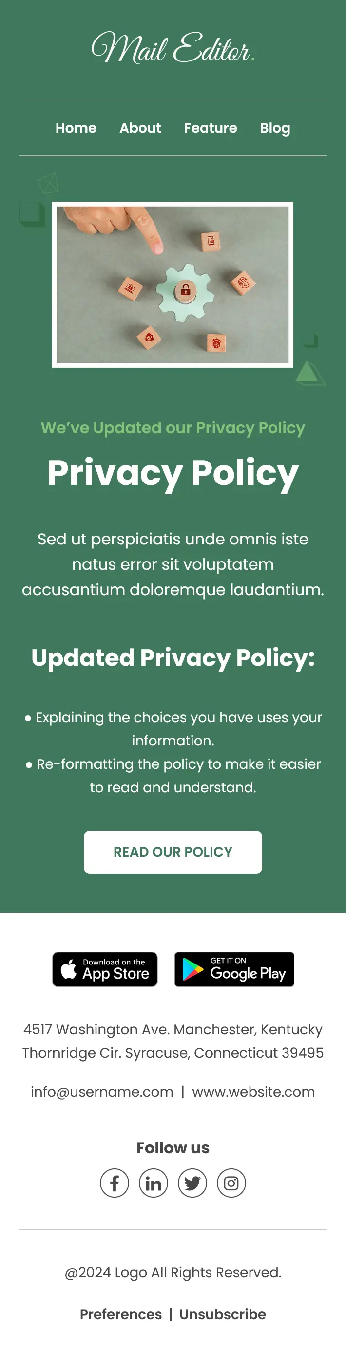 The layout of this privacy-policy-update-newsletter-template begins with a clean header and navigation links such as Home, About, Feature, and Blog. A strong headline clearly states that the privacy policy has been updated, immediately informing the recipient of the purpose of the email.