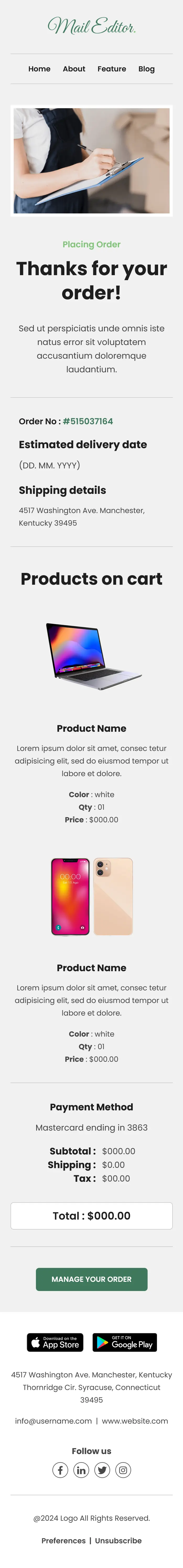 The layout of this purchase-receipt-email-template begins with a branded header and navigation links such as Home, About, Feature, and Blog. A clear message like “Thanks for your order” confirms the transaction and sets a positive tone. Supporting text provides additional context and appreciation.