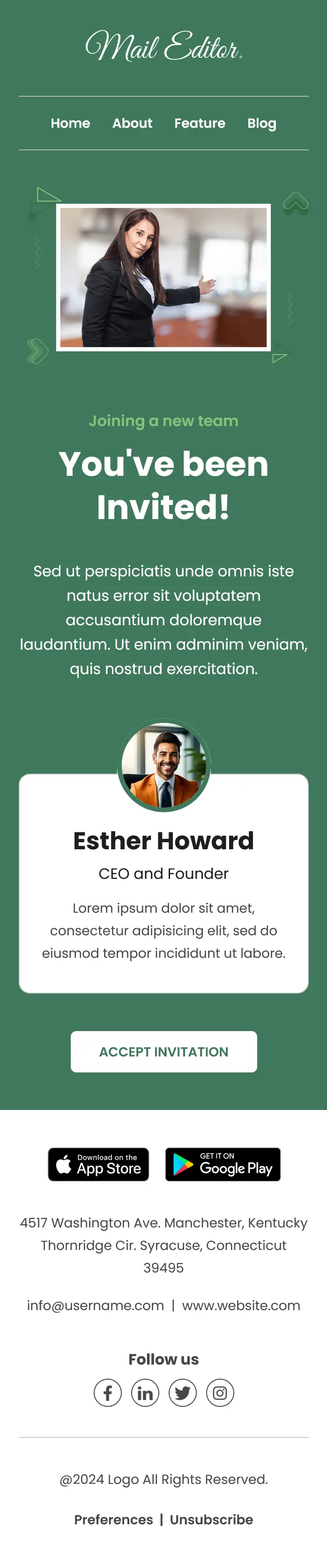 This team-invitation-email-template begins with a clean header and navigation (Home, About, Feature, Blog), followed by a welcoming banner and headline like “You’ve Been Invited!”. This immediately communicates purpose and builds excitement.