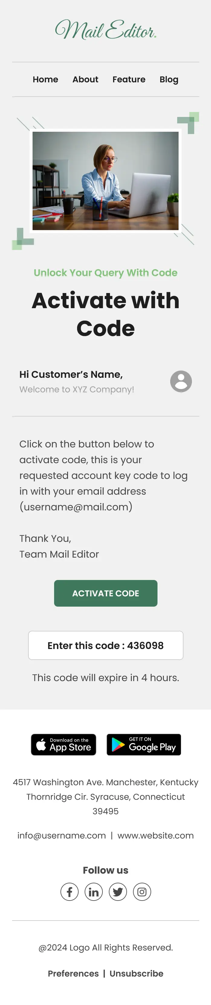 This user-verification-email-template begins with a clean header and navigation (Home, About, Feature, Blog), followed by a strong headline like “Activate with Code” or “Unlock Your Account”. This immediately communicates the purpose of the email.