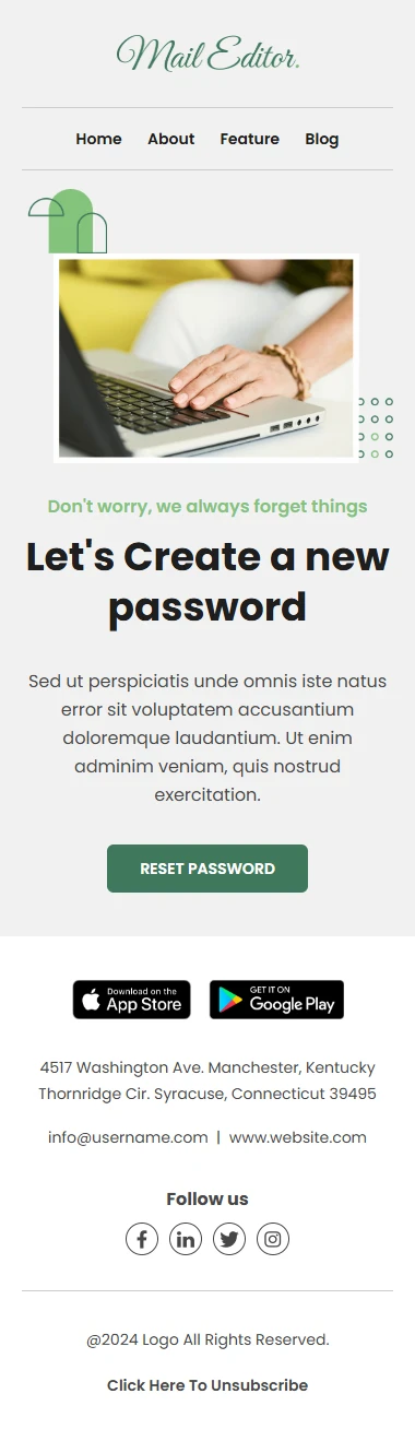 The layout of this password reset email template starts with a clean header that includes the company logo and navigation links such as Home, About, Feature, and Blog. Below the header, a large banner image supports the message with a friendly headline that reassures users that forgetting passwords is normal. The email introduces the main action with the text encouraging the user to create a new password. Supporting text provides a short explanation about the reset process and encourages the user to proceed. A prominent Reset Password button is placed in the center of the email, making it easy for recipients to complete the action quickly.