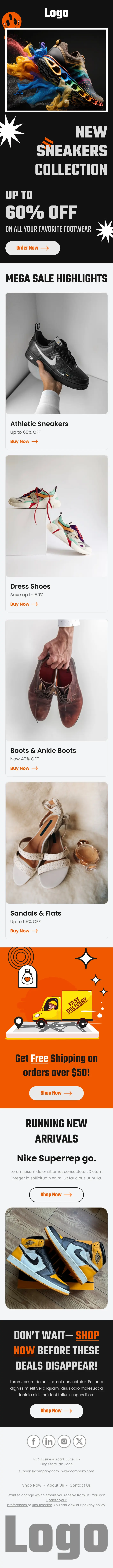 The template also highlights additional benefits like free shipping on orders over fifty dollars, helping motivate customers to complete their purchase. A featured section introduces a new running shoe release, presenting product details along with a call to action for shoppers who want to explore the latest arrivals. The email ends with a reminder encouraging customers to shop before the deals disappear, reinforcing urgency.