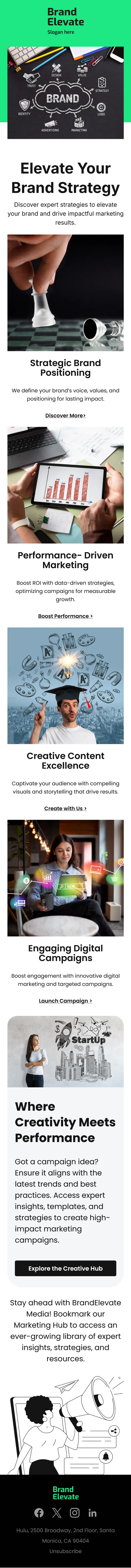 The template also includes a dedicated section titled “Where Creativity Meets Performance,” which invites readers to access expert resources, campaign strategies, and creative tools. A marketing hub promotion encourages users to stay updated with industry insights and practical marketing guidance. The footer completes the email with brand information, social media links, and an unsubscribe option.